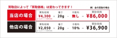 他社批判になるといけませんので、慎重に説明させて頂きますが、上記例のように、例えば金の買取について何らかの手数料が発生する事は、通常、ありません。金の売買で何か特殊な手数料が発生する事はないのです。