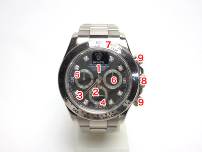 9.プッシュボタン・・・クロノグラフを制御するボタン。リューズの上がスタート/ストップ、下がリセットです。