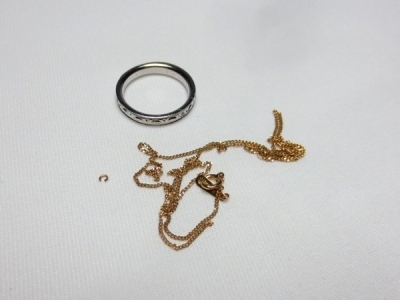 こちらはK18ネックレスとPtの指輪です。指輪は壊れていませんが、ネックレスは切れてしまっています。 このように、切れてしまっては、「装飾品」としてのネックレスの価値はありませんが、「金」としての価値は、切れていようが切れていまいが、変わりません。あくまでも、1g=いくら、という買取金額によって、買取額が算出されます。